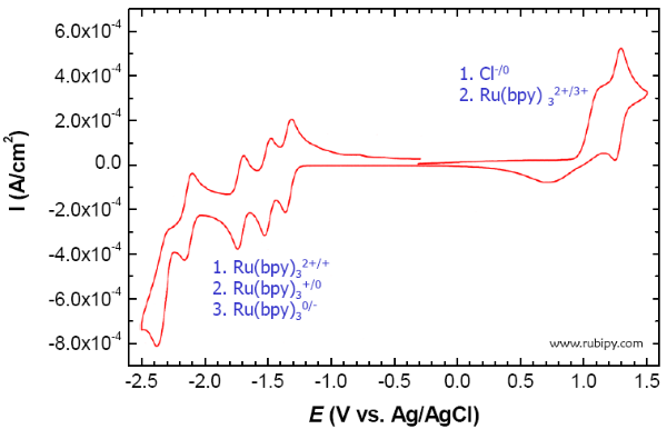 Cyclic voltammogram of Ruthenium(II)trisbipyridine dichloride in acetonitrile